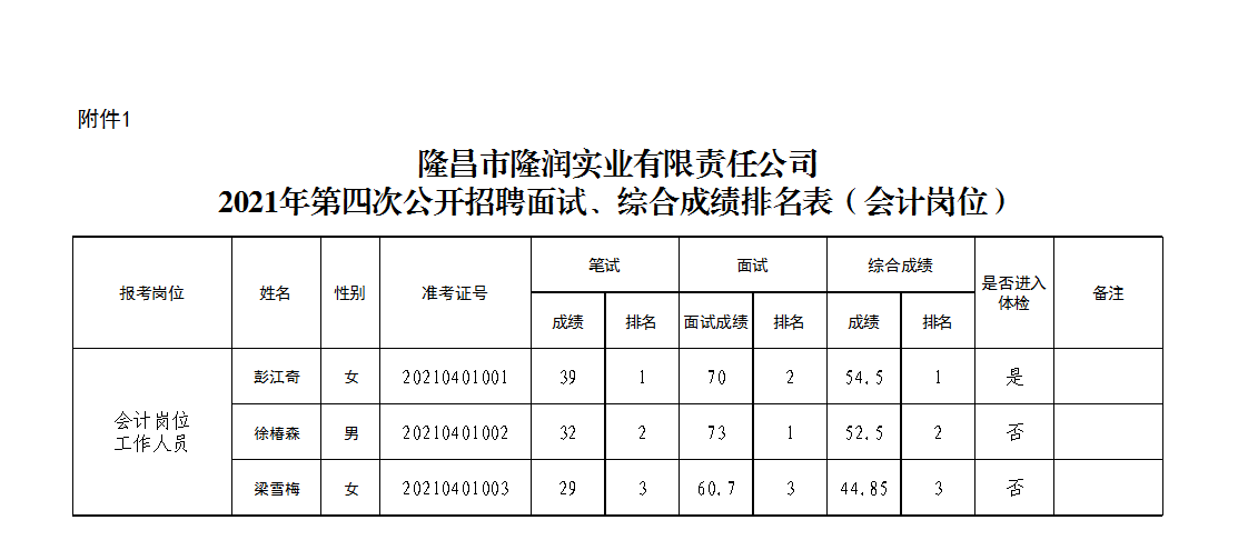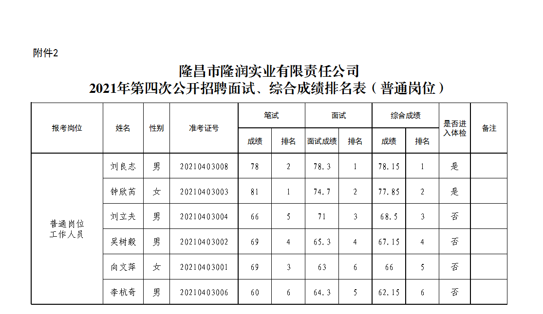 根據隆昌市隆潤實業有限責任公司《2021年第四次公開招聘公告》相關規定,現將面試、綜合成績公示(詳見附表)。