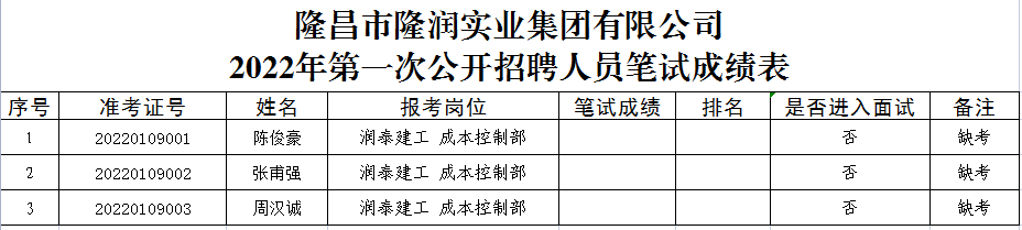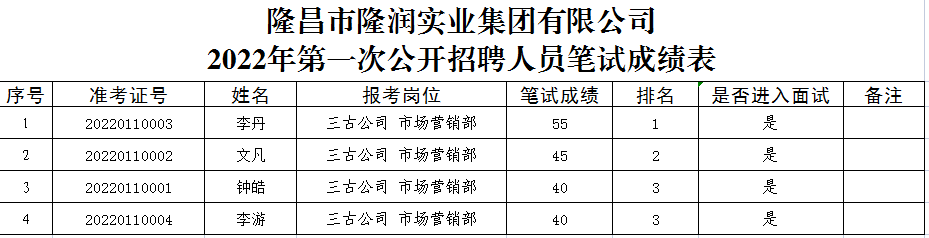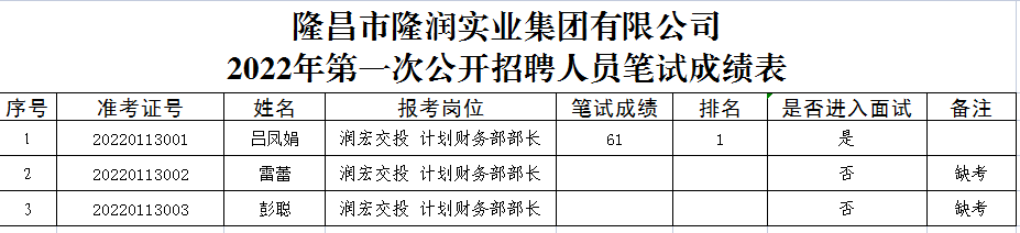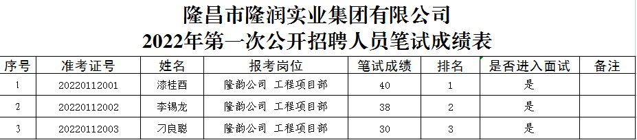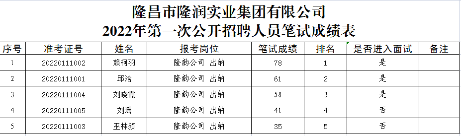 根據隆昌市隆潤實業集團有限公司《2022年第一次公開招聘公告》相關規定,現將筆試成績公示(詳見附表)。
