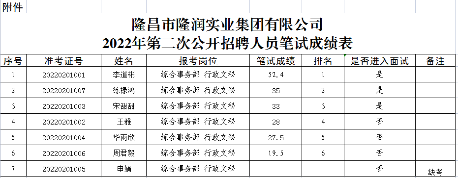 根據(jù)隆昌市隆潤實(shí)業(yè)集團(tuán)有限公司《2022年第二次公開招聘公告》相關(guān)規(guī)定,現(xiàn)將筆試成績進(jìn)行公示(詳見附表)。